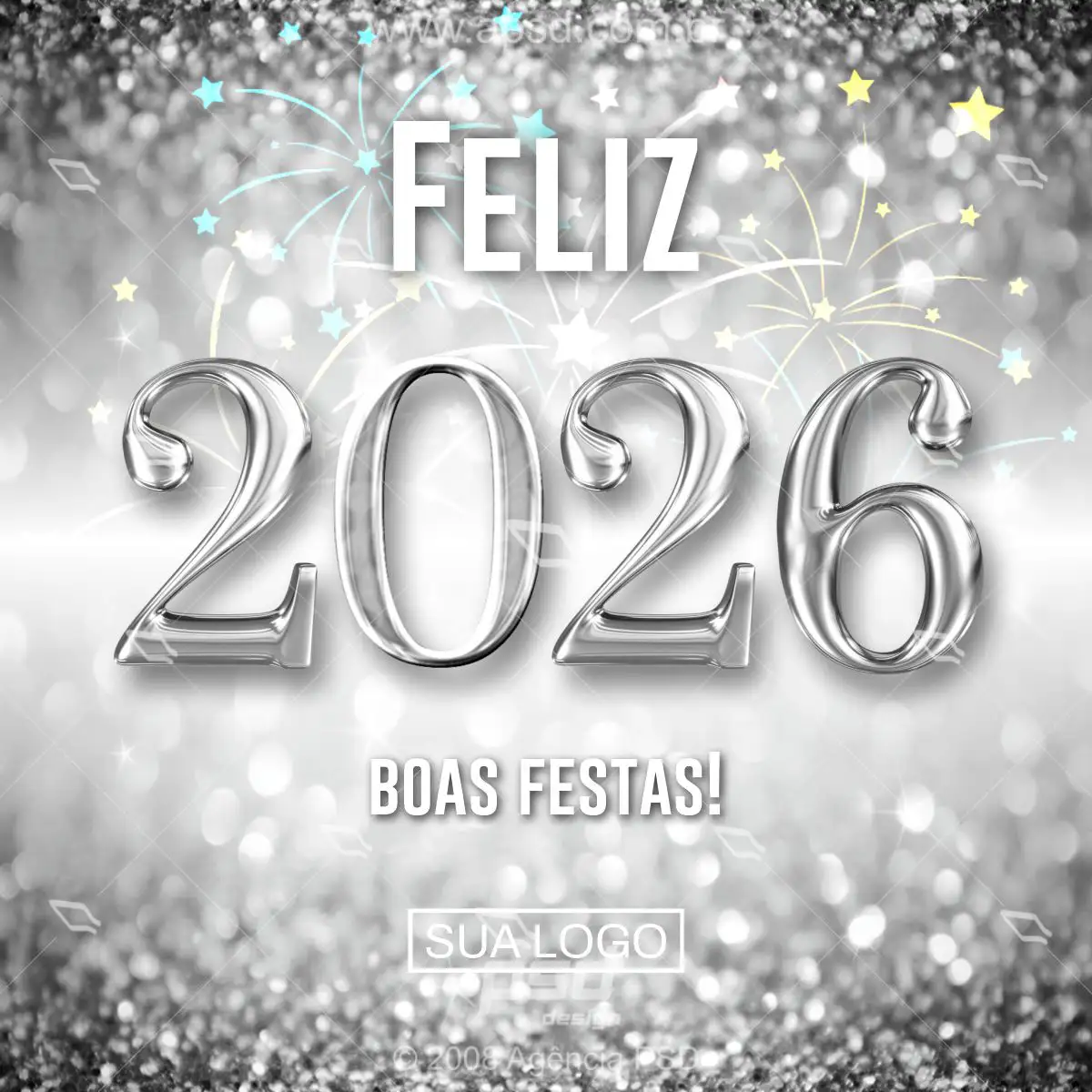 Arte feliz 2026 prata, arte pronta para usar em suas redes sociais, ganhe tempo. Deseja um feliz ano novo para seus amigos e clientes!