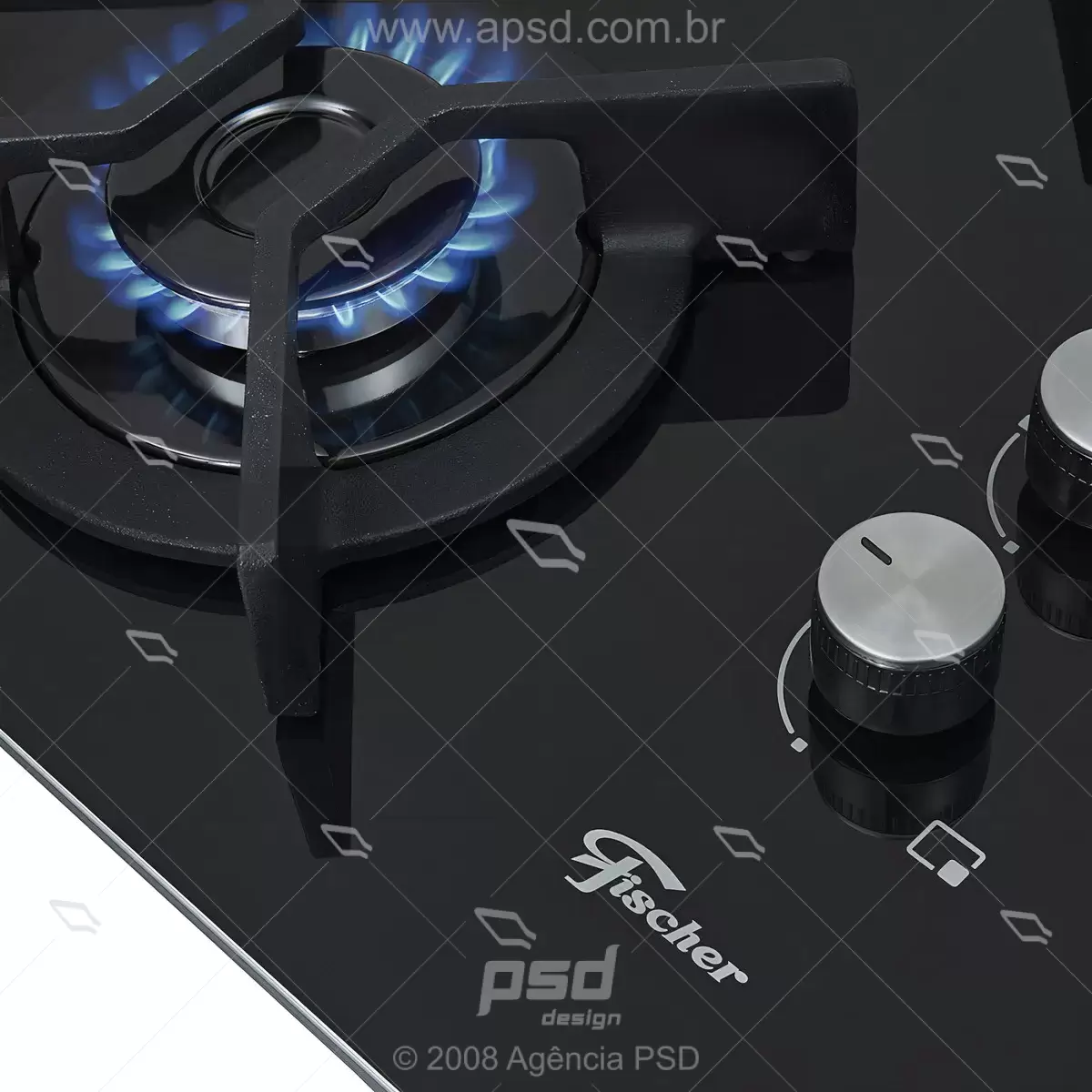 Cooktop Fischer a gás com tripla chama, trempes de ferro fundido e mesa de vidro, ideal para cozinhas residenciais.