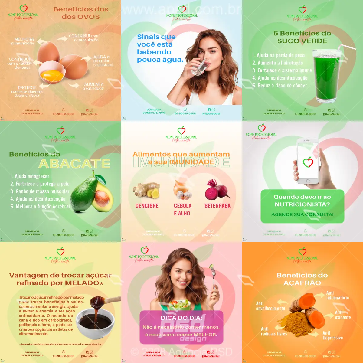 Pack 16 Artes de nutricionista Editáveis no Corel + sugestão de logotipo.