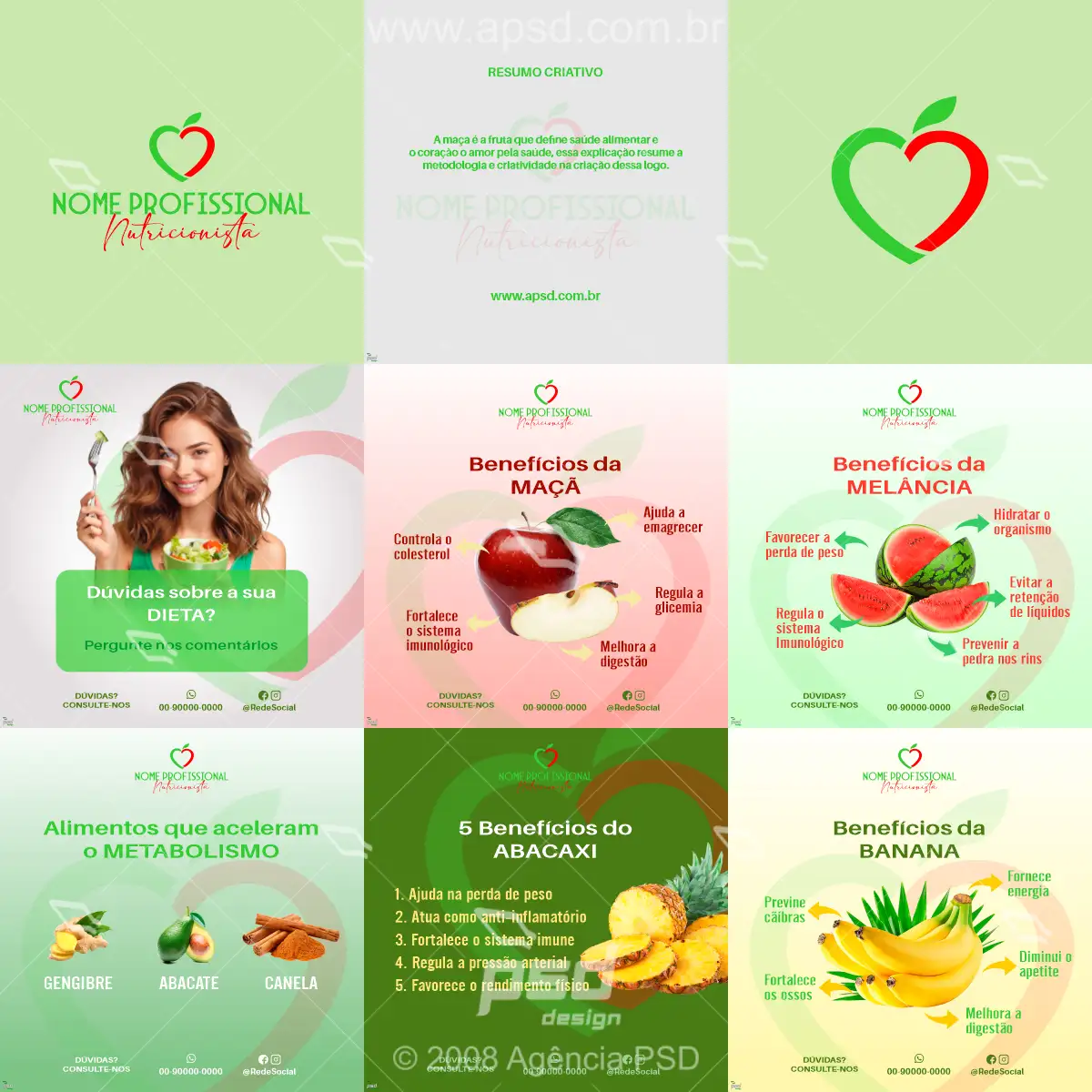 Pack nutricionista mídias com sugestão de logo, artes prontas e editáveis, altere sua logo, textos e cores como desejar, ganhe tempo, comprou, baixou!
